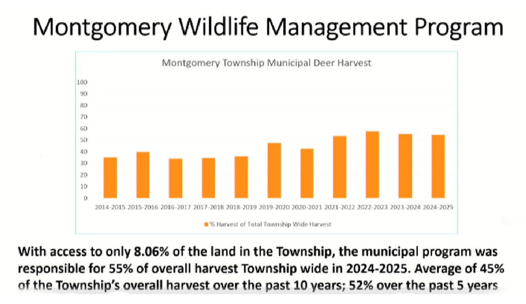 Despite being conducted on only 8.06% of township land, the program accounts for 55% of the total deer harvest in Montgomery. One of its biggest benefits, is the partnership with Hunters Helping the Hungry, a nonprofit that donates venison to food banks. Statewide in 2024–25, the initiative provided over 40,000 pounds of venison, creating more than 161,000 meals. Locally, Montgomery’s hunters donated 82 deer, yielding 2,567 pounds of venison and over 10,000 servings for families in need.