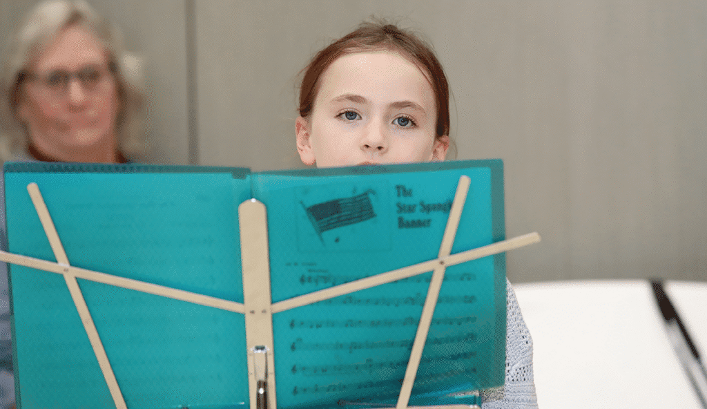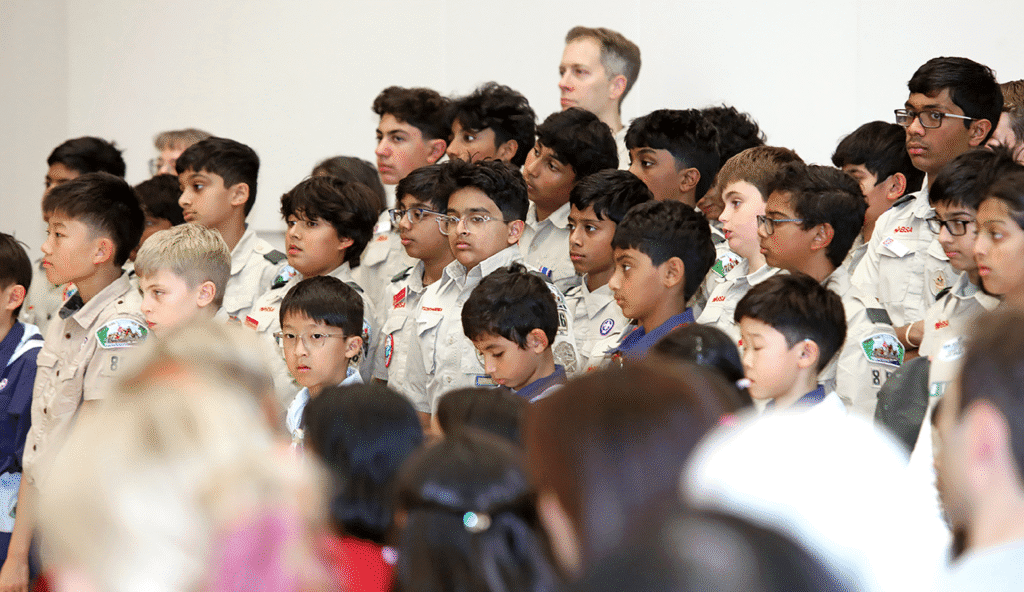 The program began with the Presentation of Colors by Montgomery scouts led by Scout Leader Simon Clark, accompanied by members of the 6th New Hampshire Volunteers from the United States Volunteers. Following the posting of the colors, LMS student Riona Uppal led the National Anthem.
