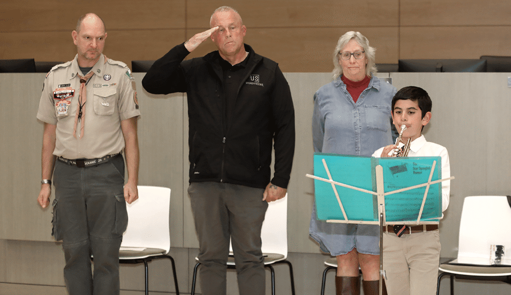 As part of the ceremony, Bairaktaris invited veterans in attendance to stand and introduce themselves by sharing their full name, branch of service, rank, years of service, and operations or engagements in which they served, with scouts assisting by circulating microphones.