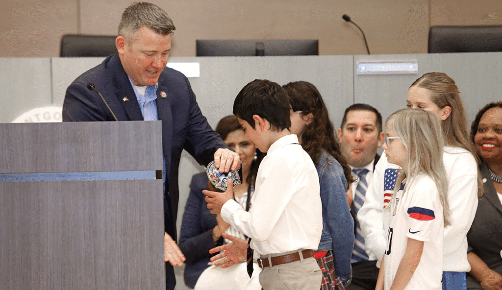 Local students played a central role in the ceremony. Montgomery Lower Middle School students selected for the program read letters they wrote to veterans. Members of the LMS Choir — Gianna Gao, Mukthineni Madhumitha, Keshav Nath, Jaya Patel, and Riona Uppal —performed “America the Beautiful.” In recognition of their contributions, students received commemorative patches presented by a special guest, Retired U.S. Navy Captain Steve Halle. Over a 26-year career in the Navy’s Submarine Force, Captain Halle served aboard four submarines and deployed worldwide; his career culminated in command of the Navy’s fast-attack submarine USS New Jersey (SSN 796), where he served as the Plank Owner Commanding Officer.